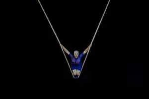 Discipline utilisant un trapèze simple accroché à grande hauteur, nécessitant une amplitude de 14 mètres, où se balance l’acrobate pour accomplir différentes figures et acrobaties.