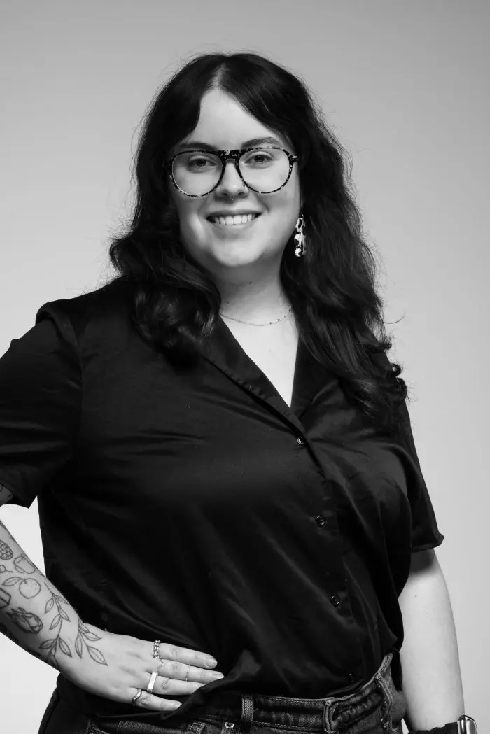Une femme aux longs cheveux noirs, aux lunettes et aux boucles d'oreilles à motifs sourit à la caméra. Elle porte une chemise boutonnée à manches courtes et a des tatouages sur l'avant-bras. La photo est en noir et blanc.